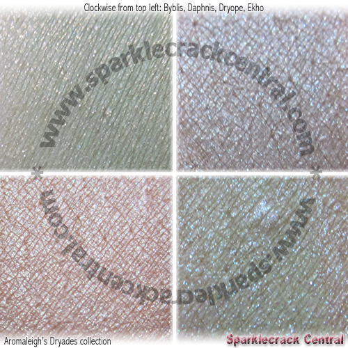 Dryades is one of four seasonal collections, named after groups of nymphs: Dryades in the fall, Asteriai in winter, Anthousai in the spring, Okeanides in summer. This set was one of the more problematic sets of samples to swatch, for me. They all appeared slightly hydrophobic: they would not blend easily with water, and when they finally did blend, the resulting mix was often clumpy and sluggish, and would not foil smoothly