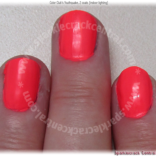 I have several neon pinks from Color Club, but I think this is the only neon red. It looks like it might be pink in their vendor photos (which are “arte” and thus only loose interpretations…dang it Color Club, stop that shit) but it’s definitely a bright neon red. It reminds me of a brighter version of the “cherry” dipped cones that Dairy Queen used to sell when I was a kid. The formula is fairly good, but a little on the liquidy side. My manicure in these photos is two coats without a white base, so you can see how the color really glows.