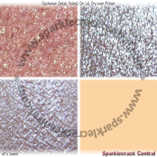 Very very pale pastel pink. Almost more of a white-pink shade. I can get this to work as a highlighter, but the predominant color that I see, when this is applied, really is “soft white” rather than pink. I think most of that comes from the metallic finish being very reflective, and the albedo overpowering any hints of the super-soft pink this eyeshadow has.