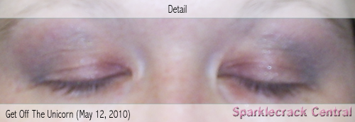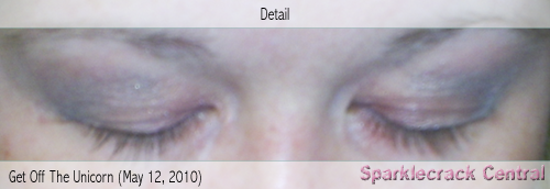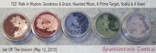I didn't set out to build an all-The SheSpace look...it just ended up that way. I patted Walk In Wisdom and Goodness and Grace right over the paint-pot base, then added small amounts of the two crease colors and blended. I was going to use Vodka and a Vixen to highlight, but decided instead to tone down the crease colors. Even applied very lightly, they're pretty strong.