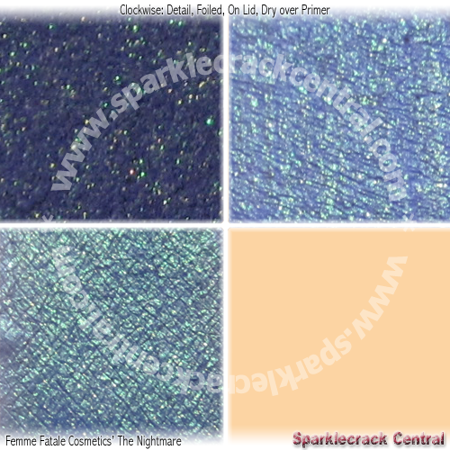 The purple base color is very evident when this is foiled - and then it's almost a candied blue-violet. The aqua-green is strongest when applied dry. Then it looks like a metallic green with violet-blue shadows.