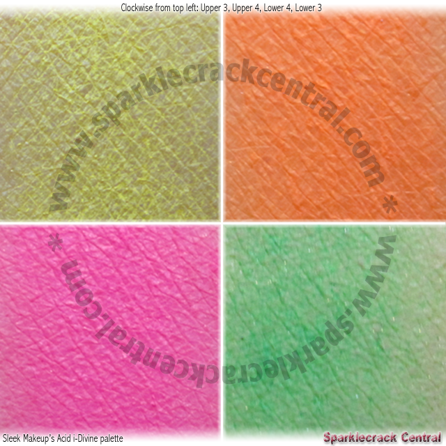 I love bright colors when they’re saturated and fairly well pigmented. The Acid palette looks very attractive, and if a few of the shadows aren’t truly “neon”, they’re all bright shades with good color payoff. (The Revolution Acid Brights palette, which was a dupe of this one, is noticeably less intense.) This differs from the Chaos palette in that these are essentially neon or near-neon shades, while the Chaos palette is a mix of neons and vivids, with more “vivid” than “neon.” Like all of the Sleek i-Divine palettes, these colors perform a bit better if they’re stippled or patted on rather than swept.