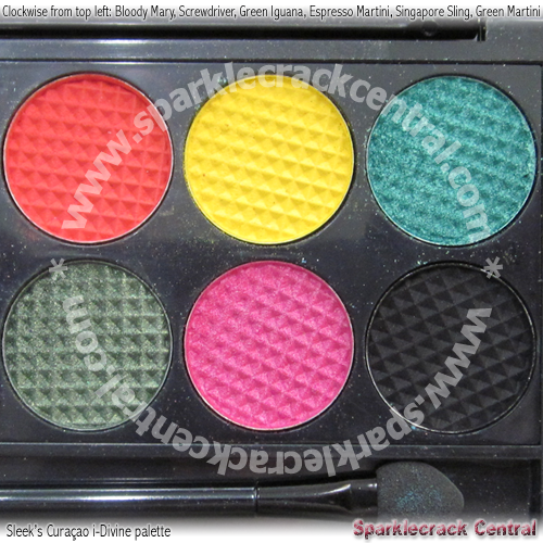 Tequila Sunrise is a lovely orange - a medium-deep shade, with a bit of shimmer. It applied very nicely. Martini (2nd in the top row) is kind of weak. It's a shimmer, but it barely shows up when I swatch it, and it swatched unevenly for some reason. It'll make a nice enough highlighter, but I think I'd have to work to get this to be an all-over shade. Unlike some other Sleek mattes, Blue Hawaiian applied evenly and had a decent amount of pigmentation. Bloody Mary reminds me of Evil Shades' Lucia and Concrete Minerals' Harley Girl - but this one's entirely matte. Screwdriver has a good level of pigmentation and applies nice and even, which doesn't reliably happen with Sleek's matte eyeshadows. Green Iguana applied a bit lighter than I thought it would, with more blue undertones (or possibly I accidentally switched the swatches of Apres Midori and Green Iguana?)