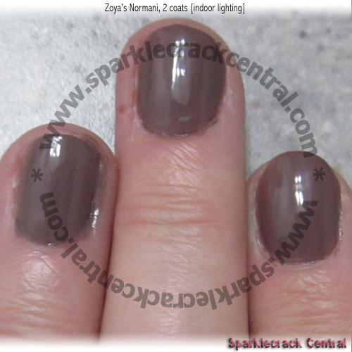 A medium-weight neutral brown creme with coverage that isn't quite up to Zoya's previous standards. They seem to have both raised their prices, AND lowered the product quality just a bit. With two coats of this polish, I had complete opacity, but not even coverage. There were a few thinner spots that a third coat did manage to correct.