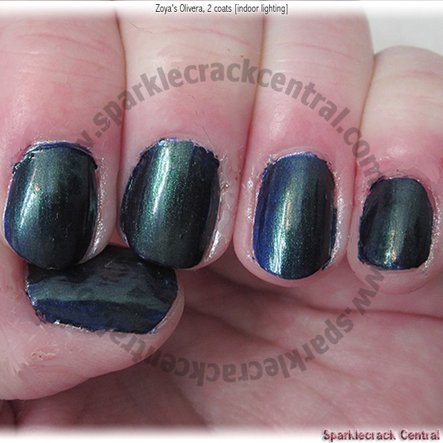 When this collection came out, I thought I might be interested in Saint, but I was sure that I’d already bought enough black-blues. I was very, very wrong. This is a dark blue, but it flashes green and violet like a beetle’s wing. One coat doesn’t quite give full coverage, but it was very close! The second coat really lets the interference colors show to their best effect.